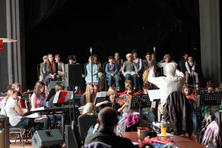 Kurz vor den Osterferien war es soweit: das Projektorchester, der Kinderchor und die Solisten trafen sich zu einer ersten gemeinsamen Probe im Großen Saal des „Philipp“. Jens Naumilkat leitete die Probe, die sich bis in den Nachmittag hinzog, stets mit Geduld und guter Laune. Die Männer vom Musicstore Brennabor sorgten für die technische Unterstützung der Laienmusikerinnen und -musiker. Eltern hatten Kuchen gebacken; am Mittag gabe eine zünftige Pizza für die Aktiven; und manchel Mal kam schon Beifall für die guten musikalischen Leistungen von Orchester und Solisten auf.